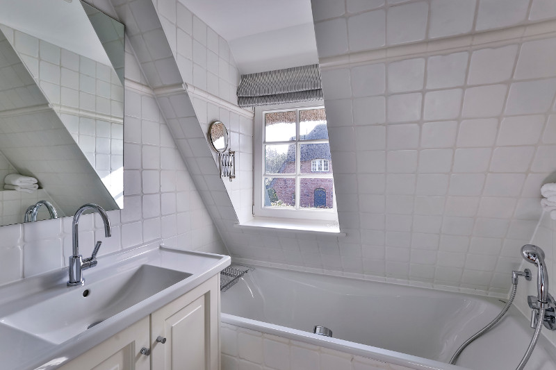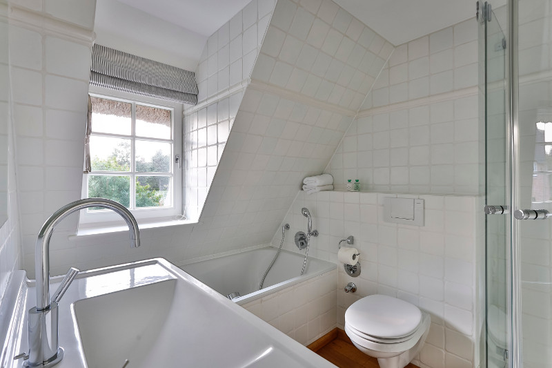 Das helle und freundliche Badezimmer verfügt über eine moderne Dusche mit Glasabtrennung und über eine Badewanne. Ausgiebigen Fahrradtouren oder Strandwanderungen steht also nichts im Wege - Sie können Ihre müden Beine im Anschluss daran in einem heißen Schaumbad entspannen. Die antiken Holzdielen sorgen für ein Gefühl der Wärme und bilden einen schönen Kontrast zu den weißen Fliesen. Das Badezimmer hat ein Fenster und bietet somit angenehmes Tageslicht.