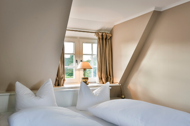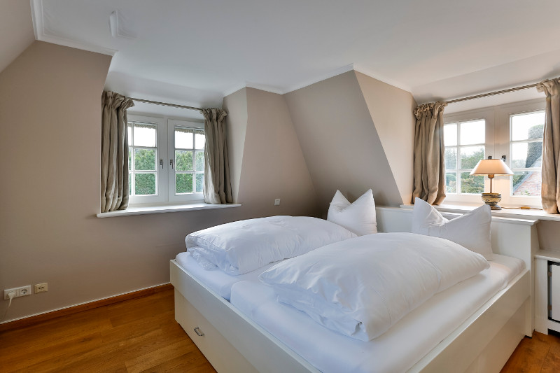Das größere der beiden Schlafzimmer verfügt über ein komfortables Doppelbett mit Bettkasten, das Ihnen nach einem aktiven Tag an der See erholsamen Schlaf ermöglicht. Moderne Einbauschränke sorgen für Geräumigkeit und Ordnung, ein Flachbildfernseher (bei Bedarf) für angenehme Unterhaltung. Das Schlafzimmer ist herrlich lichtdurchflutet, da rundherum Sprossenfenster sind. Zur Nacht lassen sich diese allesamt verdunkeln, sodass Ihr Körper auf gesunde Weise zur Ruhe kommen kann. Die antiken Holzdielen sorgen für ein behagliches Wohnklima.