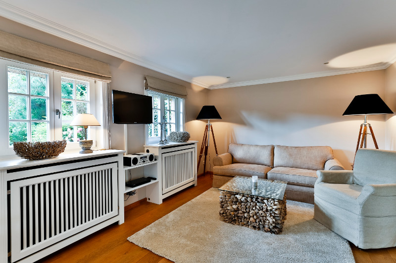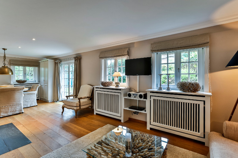 Das Wohnzimmer befindet sich im Erdgeschoss des Hauses und lädt zum Lesen, Fernsehen oder heiteren Beisammensein ein. Der offene Kamin garantiert Wohlbefinden und sorgt in der kühleren Jahreszeit für warme Füße, wenn Sie es sich auf dem bequemen Sofa gemütlich machen. Ein großer Flachbildfernseher und eine HiFi-Anlage bieten Ihnen digitales Entertainment. Die antiken Holzdielen runden die aparte, in Naturtönen gehaltene Einrichtung ab.